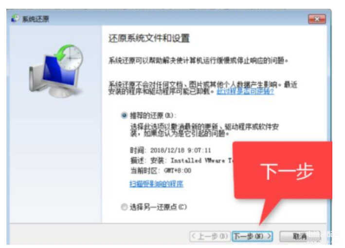 5、选择推荐的还原,并按照提示执行下一步,操作前请先备份系统。