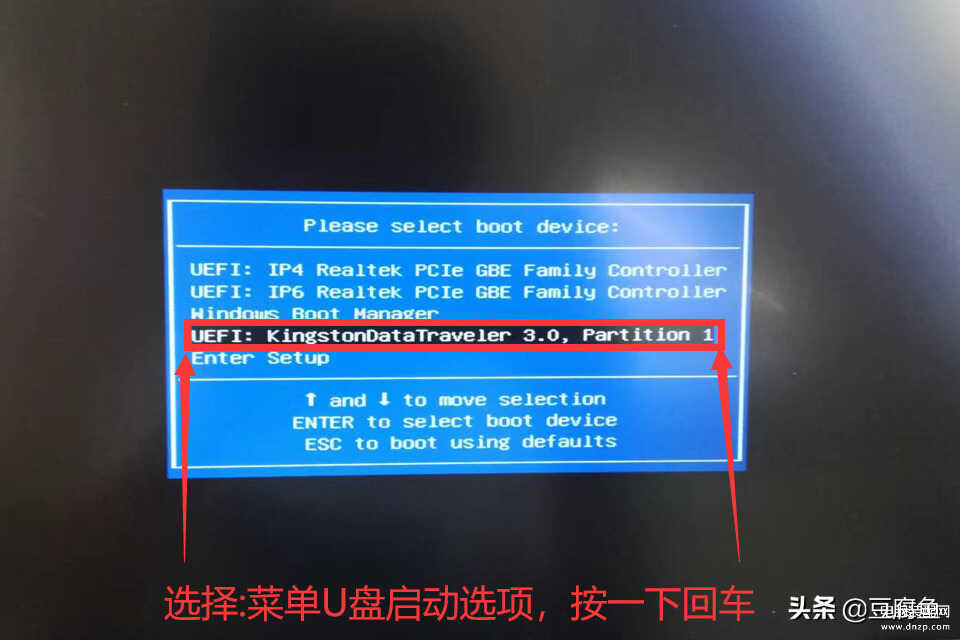 2、出现菜单选项后,选择“UEFI:KingstonDataTraveler 3.0 Partition 1”启动菜单回车,选择U盘项回车启动开始安装系统。如下图: