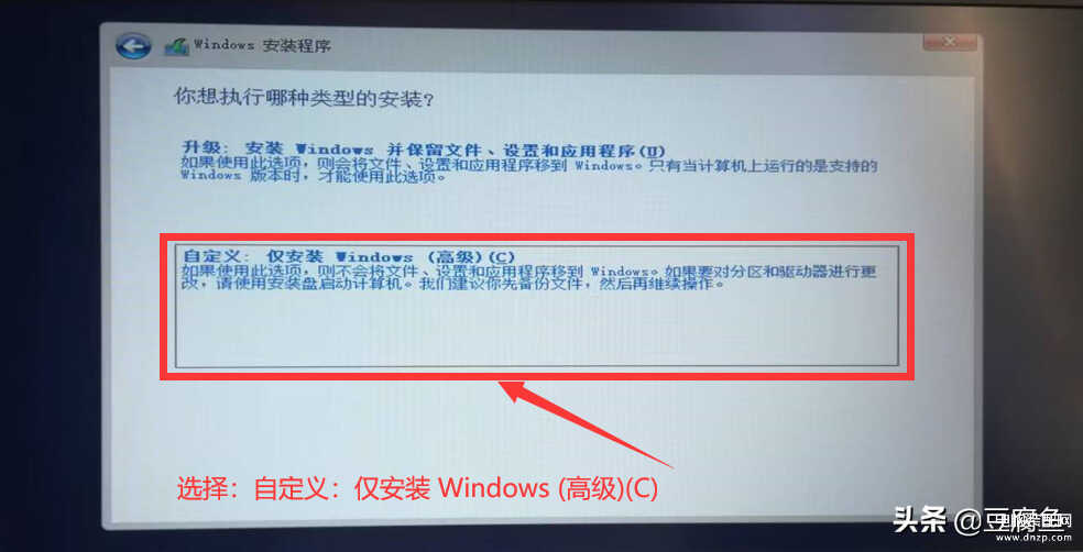 8、你想执行哪种类型的安装? 选择【自定义:仅安装 Windows (高级)(C)】,如下图: