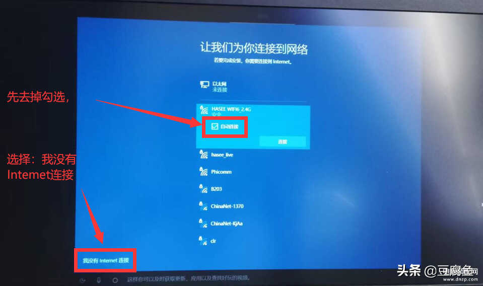17、让我们为你连接到网络,先去掉勾选,选择【我没有Intemet连接】,如下图: