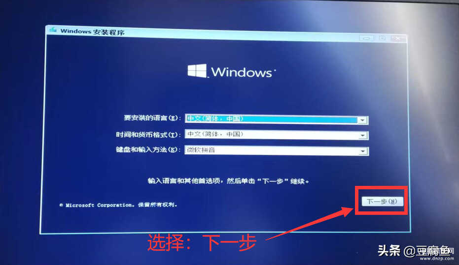 3、选择U盘引导之后,进入Win10系统安装界面,选择【下一步】,如下图: