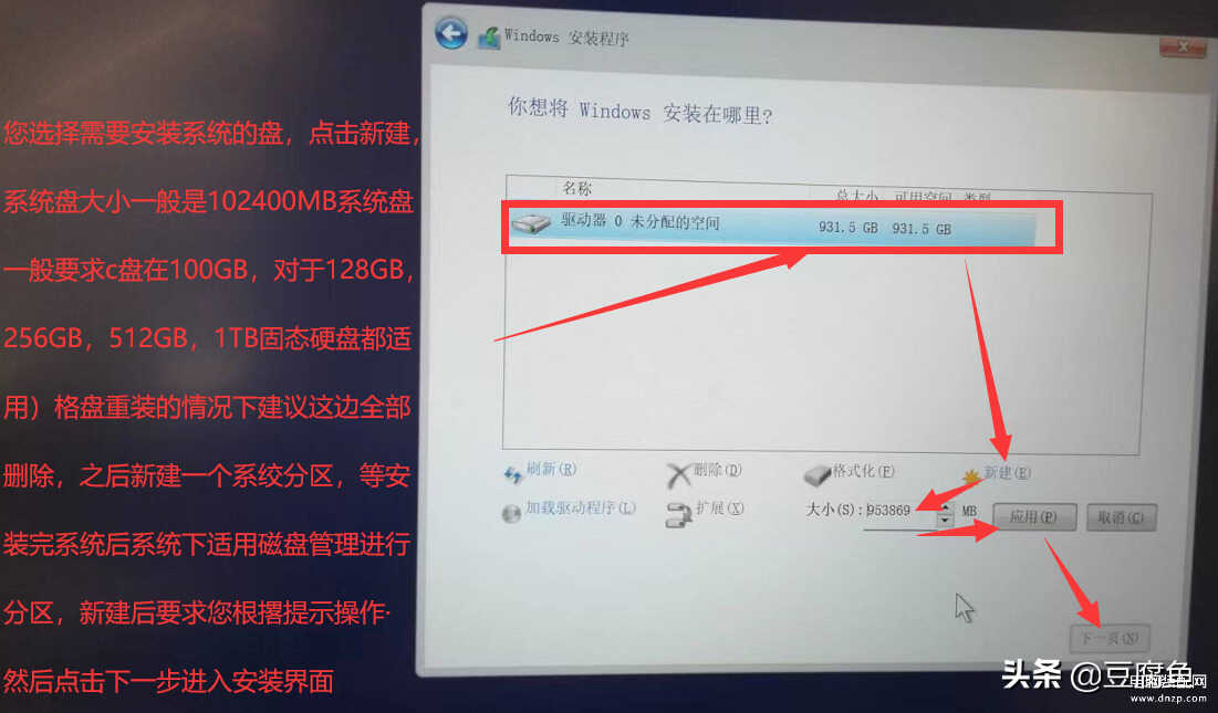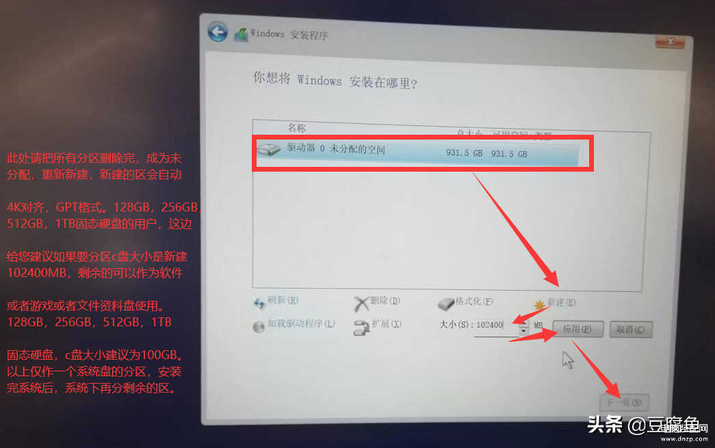 10、你想将indows安装在哪里?【此处请把所有分区删除完,成为未分配,重新新建,新建的区会自动4K对齐,GPT格式。128GB,256GB,512GB,1TB固态硬盘的用户,这边给您建议如果要分区c盘大小是新建102400MB,剩余的可以作为软件或者游戏或者文件资料盘使用。128GB,256GB,512GB,1TB固态硬盘,c盘大小建议为100GB。以上仅作一个系统盘的分区,安装完系统后,系统下再分剩余的区。】,如下图: