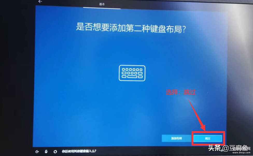 16、是否想要添加第二种键盘布局? 选择【跳过】,【如果您还需要添加微软五笔,可以选择添加布局】,如下图: