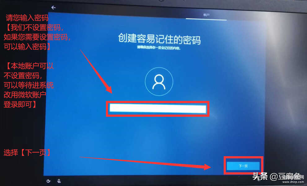 20、创建容易记住的密码,请确保选挥你一定会记住的内客。 请您输入密码【我们不设置密码,如果您需要设置密码,可以输入密码】【本地账户可以不设置密码,可以等待进系统改用微软账户登录即可】选择【下一页】,如下图:
