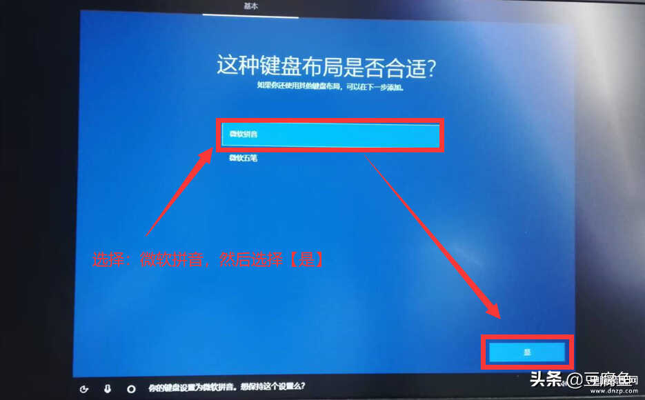 15、这种键盘布局合适吗? 选择【微软拼音】,然后选择【是】,如下图: