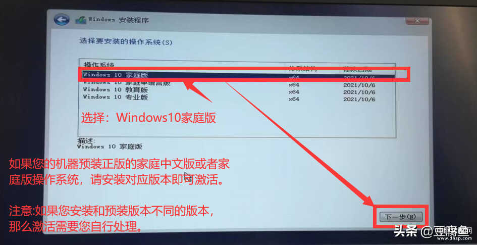 6、选择要安装的操作系统(S),选择【Windows10家庭版】,点击【下一步】,如下图:
