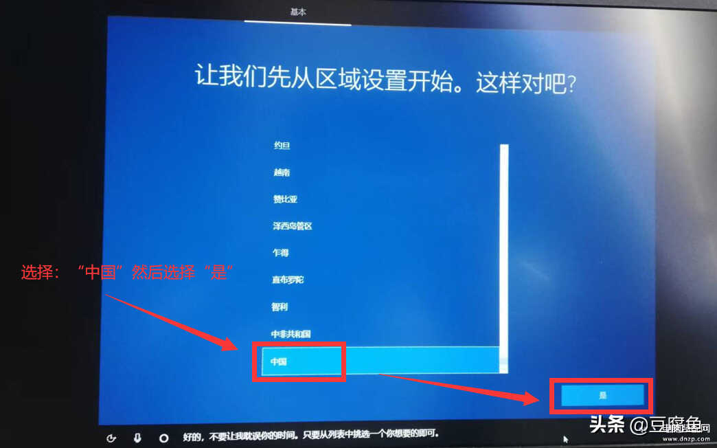 14、【小娜】的欢迎界面介绍完成之后进入正式的部署面,让我们先从区域设置开始。选择【中国】,然后选择【是】,如下图: