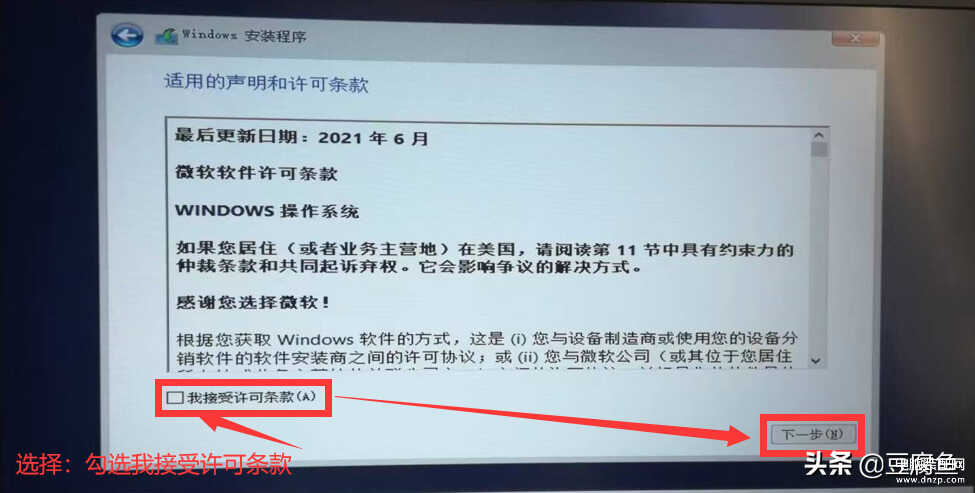 7、适用的声明和许可条款,选择【勾选我接受许可条款】,点击【下一步】,如下图: