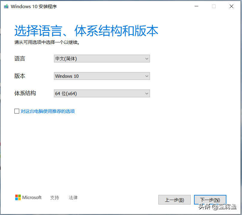 (四)去掉【对这台电脑使用推荐的选项】勾选,然后语言选择【中文(简体)】,版本选择【Windows 10】,体系结构选择【64位(X64)】 然后选择【下一步】,如下图: