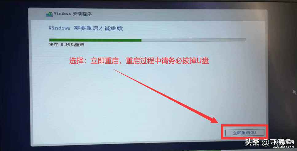 12、windows需要重启才能继续,选择【立即重启】,重启过程中请务必拔掉U盘,如下图: