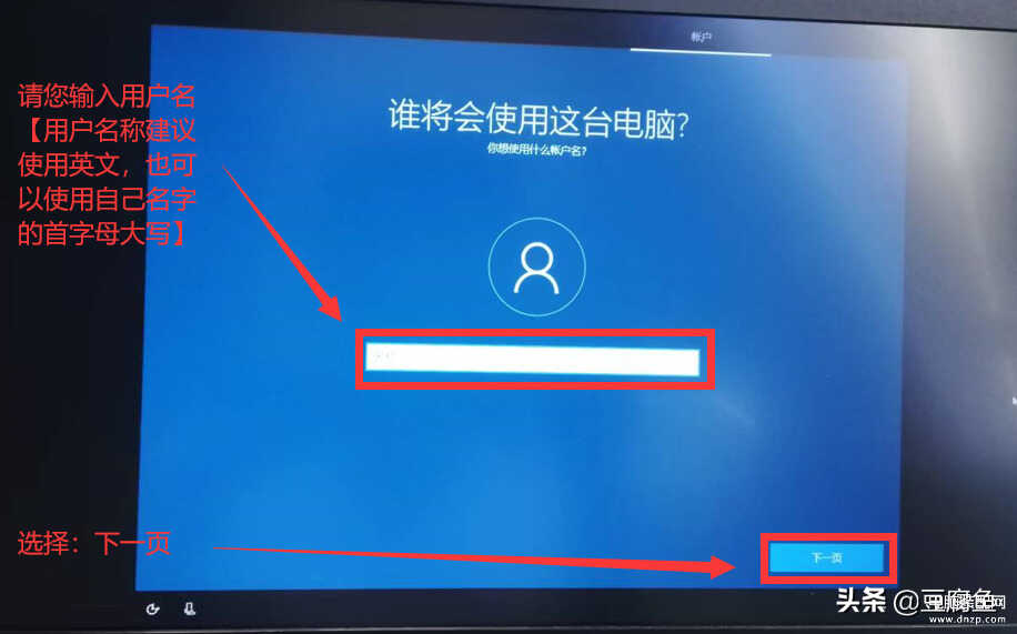 19、谁将会使用这台电脑? 你想使用什么帐户名? 请您输入用户名【用户名称建议使用英文,也可以使用自己名字的首字母大写】选择【下一页】,如下图: