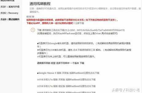 目前官方提供的刷机教程有3种方法。分别是:方法1:系统内升级,方法2:Recovery升级,方法3:通过线刷升级。