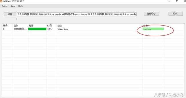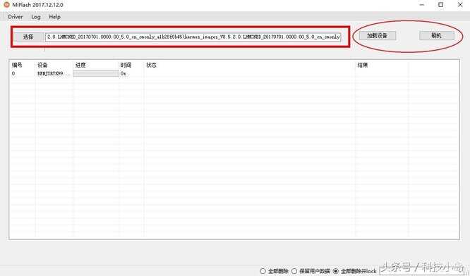 打开通用刷机工具XiaoMiFlash.exe运行,将上面复制的地址栏的地址到下图红色区域位置,点击圈中选部分"加载设备",刷机程序会自动识别手机,点击"刷机"开始刷机。