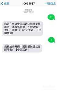 联通用户:发送短信“KT”到“10655587”,之后联通会让我们确定,再发送“Y”即可大功告成。
