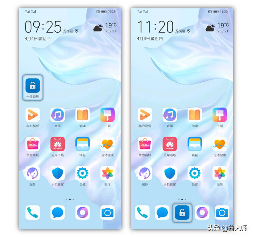 3. 添加成功后,我们还可以长按图标并拖动到桌面最下方(如下方右图),锁屏更便捷。