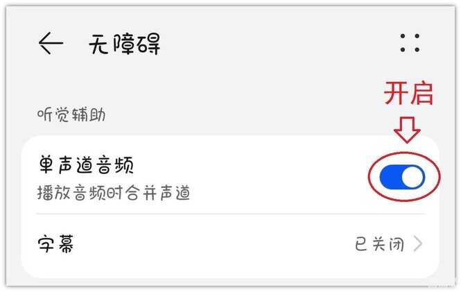 随后我们在界面上找到“听觉辅助”选项,下方有个「单声道音频」功能,点击开启后面的按钮。