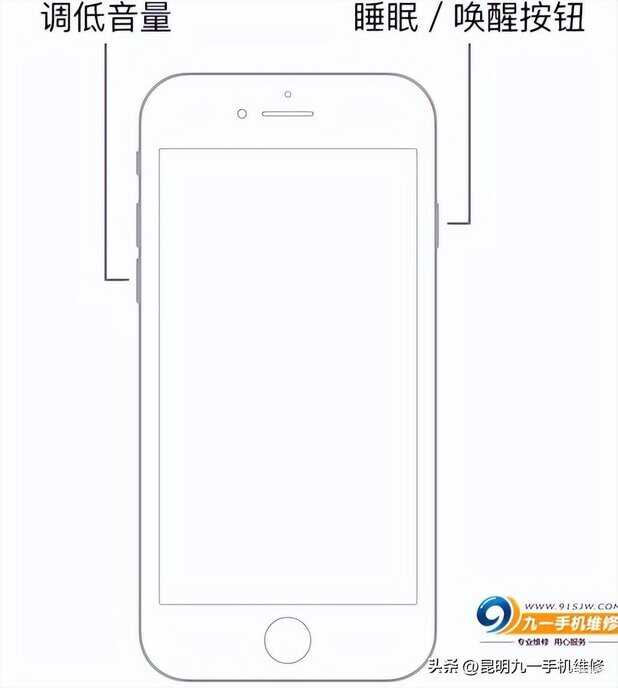 苹果7系列手机:同时按住开机键和音量减少键10s左右手机就会重启,重启以后放开所有按键。