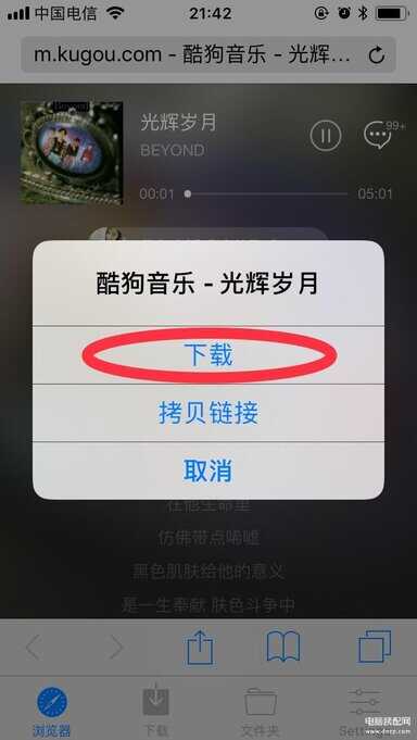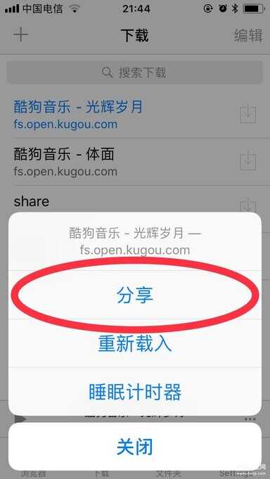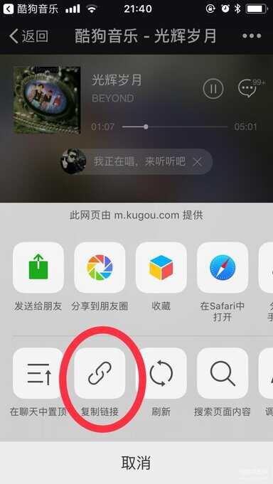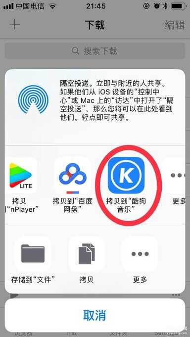 然后向左滑动,直到找到“拷贝到酷狗音乐”选项,点击,歌曲就会导入到酷狗音乐里面了!不不是很简单呢?