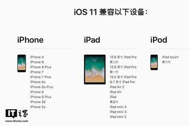iOS11支持设备包括iPhone X、iPhone8、iPhone8 Plus、iPhone7、iPhone7 Plus、iPhone5s、iPhone SE、iPhone6/Plus、iPhone6s/Plus;9.7英寸iPad、iPad Air、iPad Air 2、iPad Pro(9.7/12.9一二代、10.5英寸)、iPad mini 2、iPad mini 3、iPad mini 4,iPod方面仅有iPod Touch 6一款设备。
