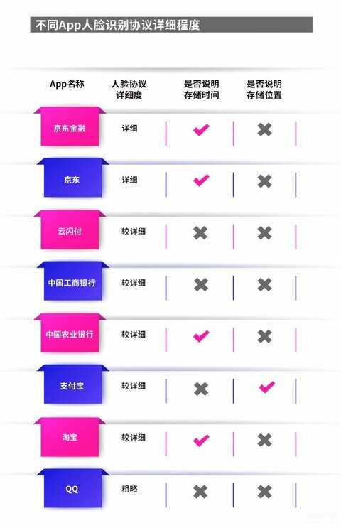“京东”“淘宝”“中国农业银行”“京东金融”4款App称将在“必需的时限”内保存人脸信息;“淘宝”进一步承诺,完成验证服务后将及时删除人脸原始图像。与“淘宝”形成对照的是,“中国工商银行”表示,每次验证中拍的图片都可能被保存,以帮助修正算法。