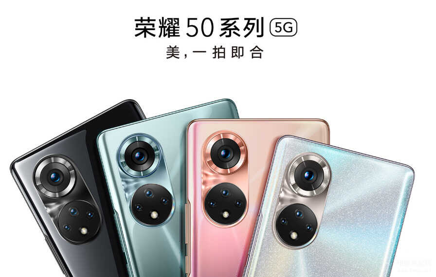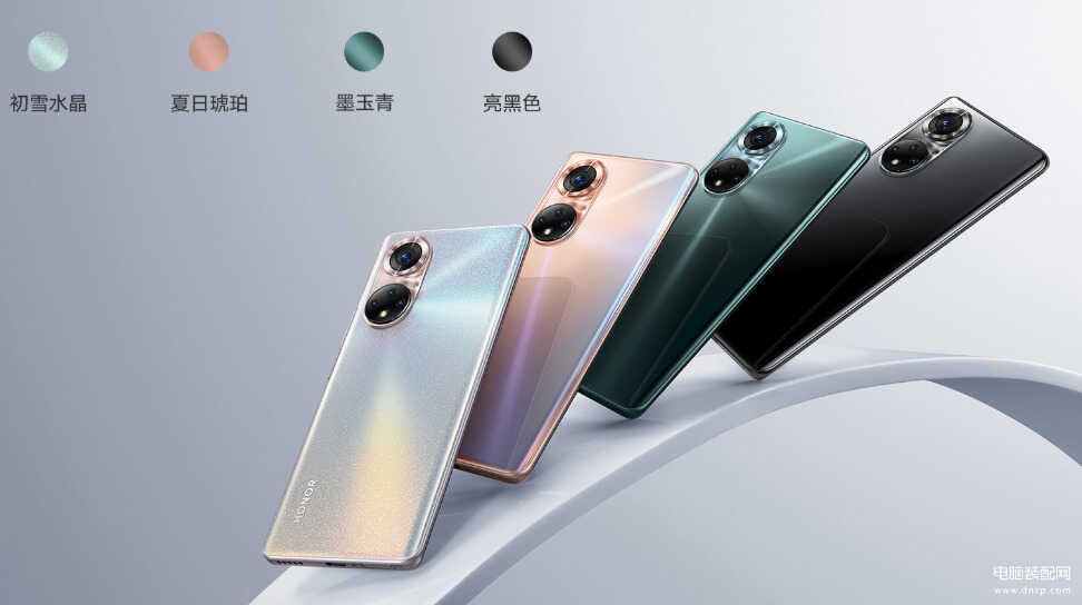 这是荣耀50的外观,包括初雪水晶、夏日琥珀、墨玉青和亮黑色以及一个新配色荣耀密码五款配色,两代产品外观设计很相似,配色上也只有两款主打配色不同,荣耀60有两款配色采用了钻采工艺。