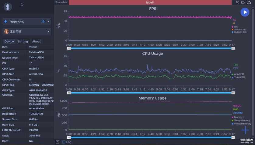 使用荣耀Play4进行游戏实测,在测试的过程中使用软件实时监测手机运行情况,在使用荣耀Play4运行《王者荣耀》时,我们将游戏画面设置为了超高画质,并开启了高刷新率模式。我们发现游戏的全程都在60FPS左右运行,帧率曲线的波动范围在1帧以内,由此可见荣耀Play4以满帧状态畅玩运行《王者荣耀》可谓是毫无压力。