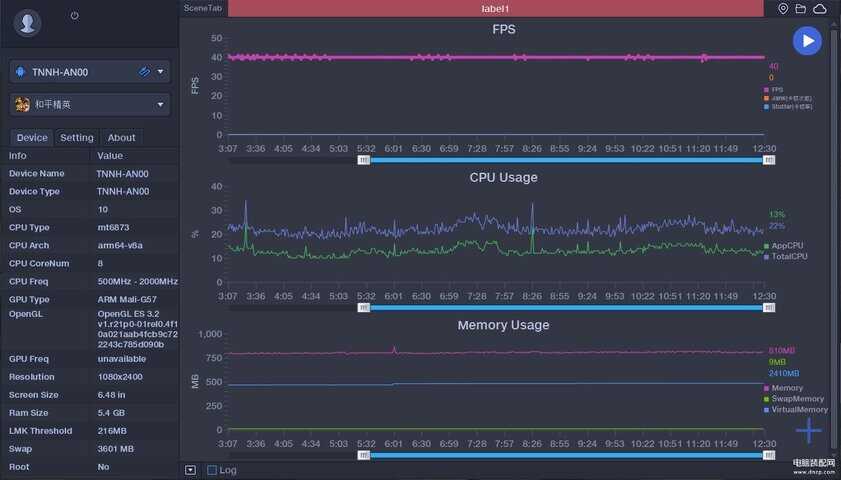 再测试的游戏是《和平精英》,同样使用检测软件来记录手机的运行情况,游戏开启HDR高清和超高帧率画质,通过曲线我们可见游戏全程保持在40FPS的最高帧数下运行,同时游戏占用处理器最低只有13%的资源,相比上一个游戏有着更低的资源占用率,同时运行内存只使用800MB左右。