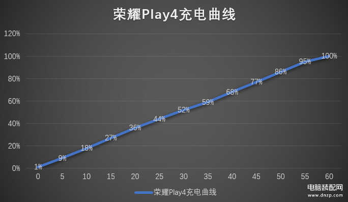荣耀Play4使用了一块4300mAh的大电池,支持22.5W闪充,实际充电测试使用荣耀Play4的原装充电插头,通过充电曲线我们可见,其5分钟能够给手机充至9%左右的电量,10分钟充至18%左右的电量,30分钟能够给手机充电52%,60分钟将手机电量充至100%。