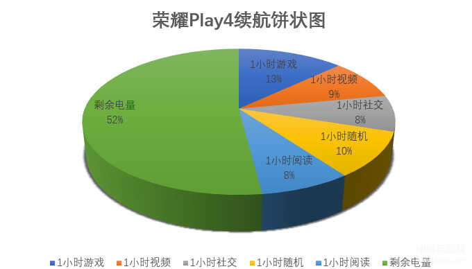 在充电的测试之后在评测的全程记录手机使用的耗电情况,截取了其中5小时的连续使用记录电量损失情况,我们发现手机在1小时游戏之后消耗电量13%、1小时视频观看消耗电量9%、1小时社交软件使用消耗电量8%、1小时阅读消耗电量8%、1小时随机使用消耗电量10%,最后还剩余52%的电量,说明手机在重度使用的情况下,可以支持一天甚至1天半的时间。