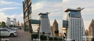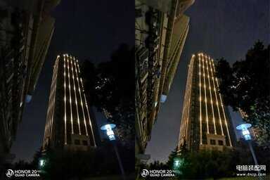 上面左图为荣耀20 Pro超广角镜头下的普通夜景,虽然建筑的主体比较清晰,但画面边缘的细节几乎全部丢失了。右图为超广角镜头下的手持超级夜景,画面明亮了不少,边缘部分的细节也变得更加清晰。
