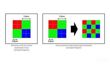今年索尼这枚IMX586传感器已经成为中高端国产手机的标配,从1500元价位到5000元价位的机型当中都可以找到这枚传感器。它虽然支持4800万像素的硬件直出照片,但绝大多数手机厂商都使用“像素四合一”技术,将其作为1200万像素的传感器使用。这是因为通过“像素四合一”,可以将4800万个0.8μm的小像素,合成为1200万像素的1.6μm大像素,从而提高单个像素的亮度。