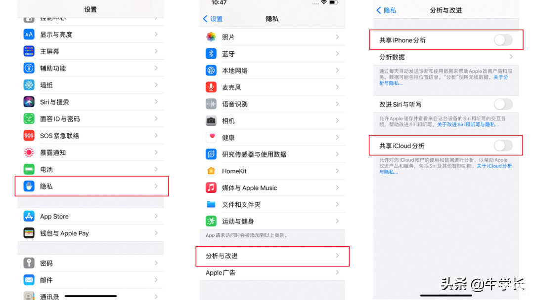 操作步骤:【设置】-【隐私】-【分析与改进】-【共享iPhone析】及【共享ICloud分析】,关闭此共享功能即可。