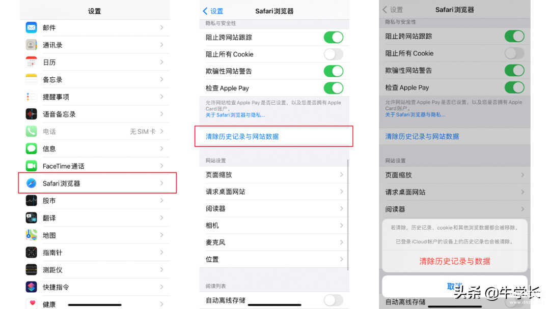 操作步骤:【设置】-【Safari浏览器】-【清理历史记录和网站数据】,点击清理即可。