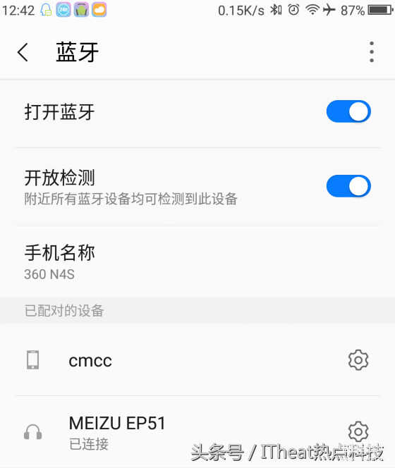2.然后打开手机——进入设置——蓝牙,打开蓝牙,在可发现选项上打上对勾,然后扫描查找设备开始搜索,很快就会搜索到了,然后选中搜索到的你的蓝牙耳机,手机会开始与蓝牙耳机配对(如果要求输入配对码,一般是默认1234或者0000),当下面变成已连接至手机和媒体音频时,就表示已经成功了,就可以用耳机打电话和听歌了!
