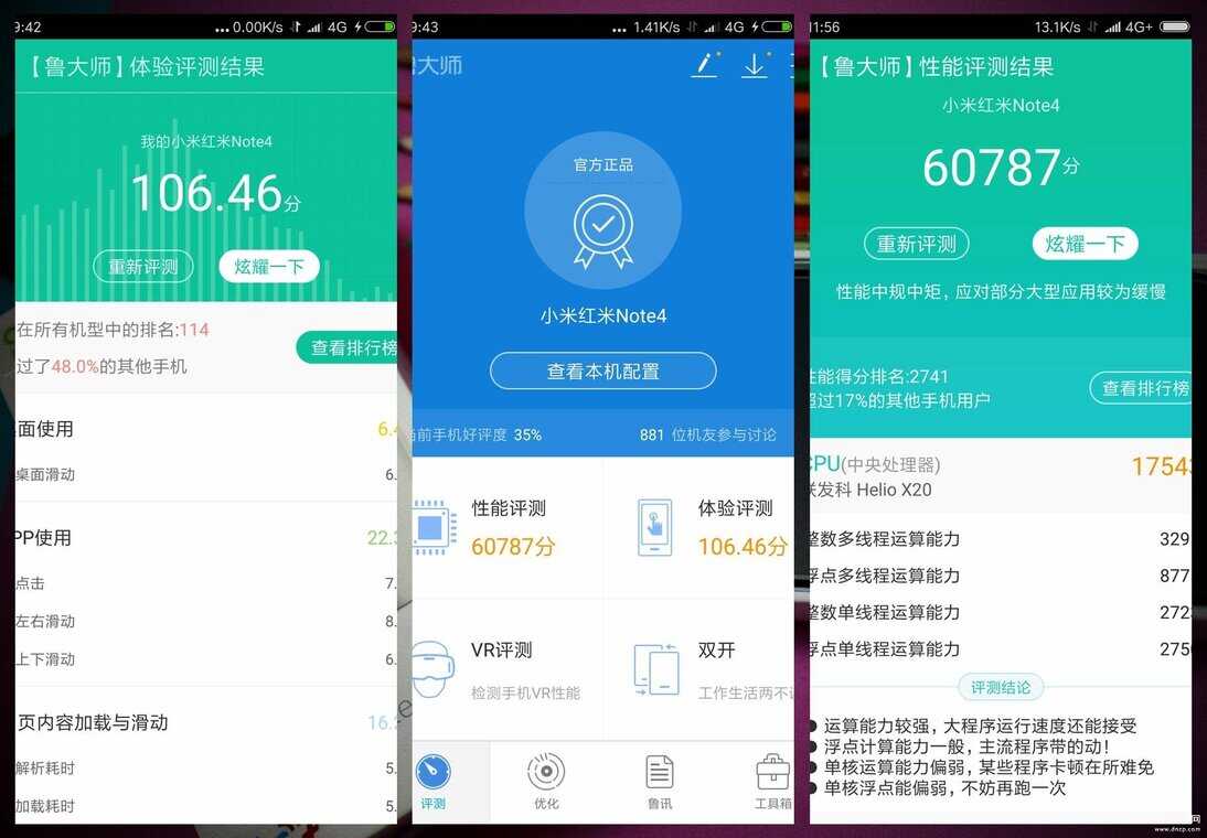 总结:整体来说红米note4是一部够用的千元机,做工与工艺很不错(又旗舰级别),但是其他方面就差强人意,而系统方面MIUI继续发挥它人性化的本质体验,而系统流畅性方面满足我们的日常需求,所以个人觉得这是一部不错的老人机,因为一般老人家都不打游戏,而红米note4的流畅性体验还是不错的,最重点的是红米note4有大容量,不怕空间没了老人家不会清理。