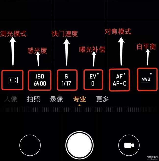 在专业模式中,从左到右分别是:测光模式、感光度(ISO)、快门速度(S)、曝光补偿(EV)、对焦模式(AF)、白平衡(AWB)。(注:大部分手机的光圈都是固定的,光圈这个参数调整不了)