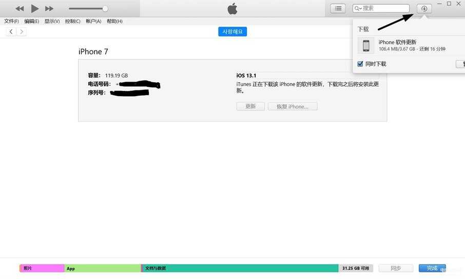 第八步:iTunes的右上角会出现一个圈包住向下箭头的符号,点击之后,出现的下拉菜单里会有正在下载的固件包,等下载完成就会开始安装了。然后等待它安装完成就好,期间不要碰iPhone以及数据线,中间iPhone会重启几次,最后一次重启就会直接开机,整个更新过程也就完成了!