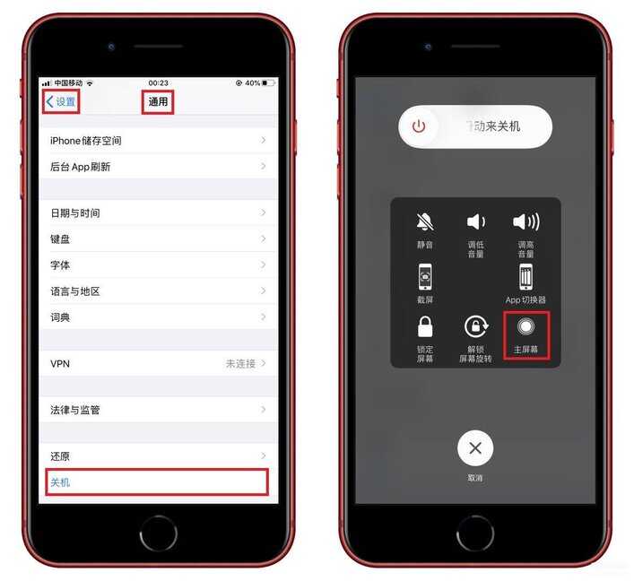 如果你的iPhone没有home键,可以使用小白点来辅助你,点击【设置】-【通用】-【关机】,然后打开小白点,长按【主屏幕】按钮也能完成清理。