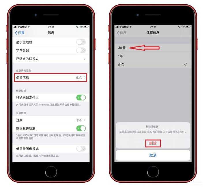手机里有大量的短信,有时候懒得清理就越积越多,你可以打开【设置】-【信息】,将【保留信息】改为30天,凡是超过30天以上的短信,都会自动删除。