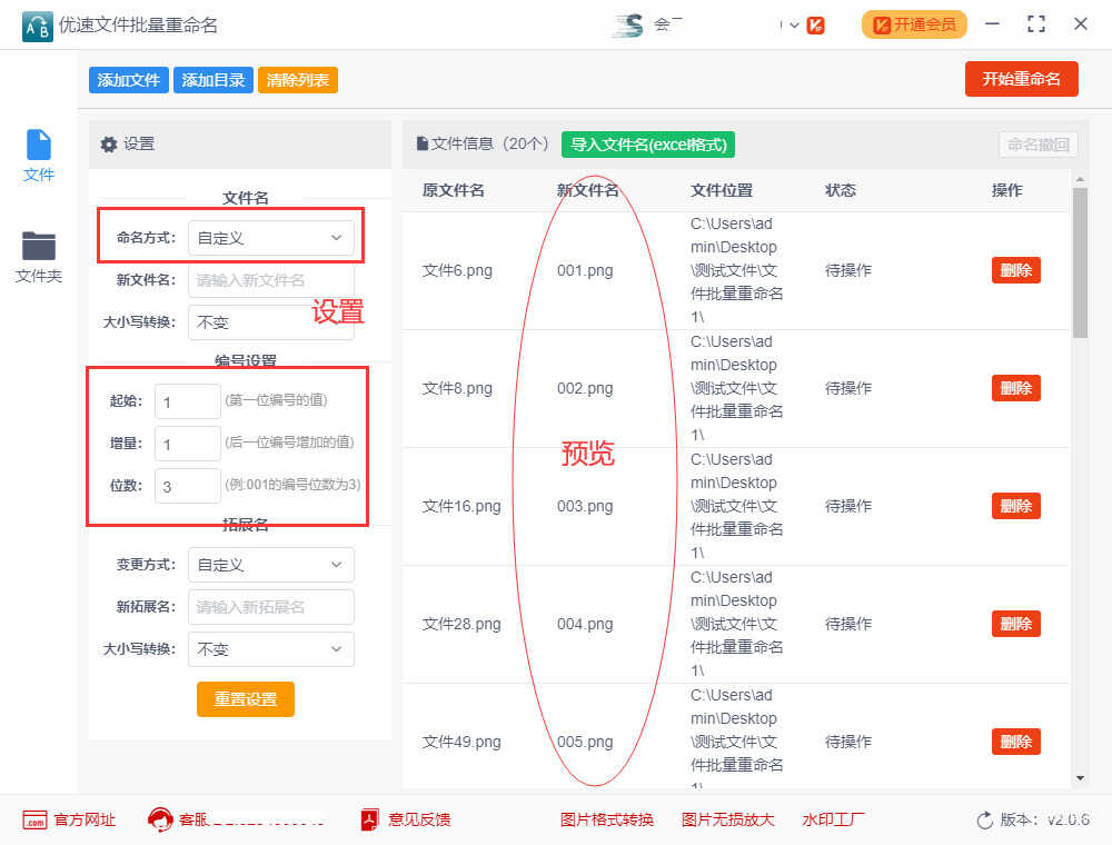 第三步,进行重命名设置,命名方式右边下拉框中选择“自定义”;然后进行编号设置,其实右边设置1,增量右边设置1,位数右边设置3。这时候在右边可以看到图片的名称变成了001.002.003.004....的样子。