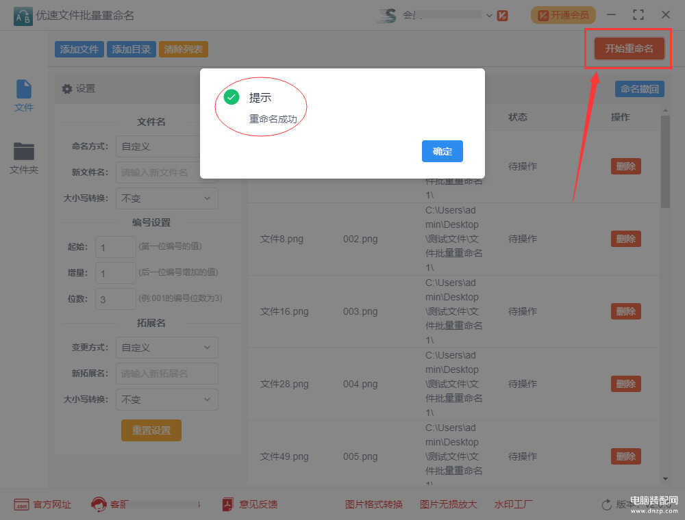 第四步,最后【开始重命名】按钮启动软件,稍微等待十几秒钟,当软件弹出“重命名成功”提示时说明图片名称全部修改完成。
