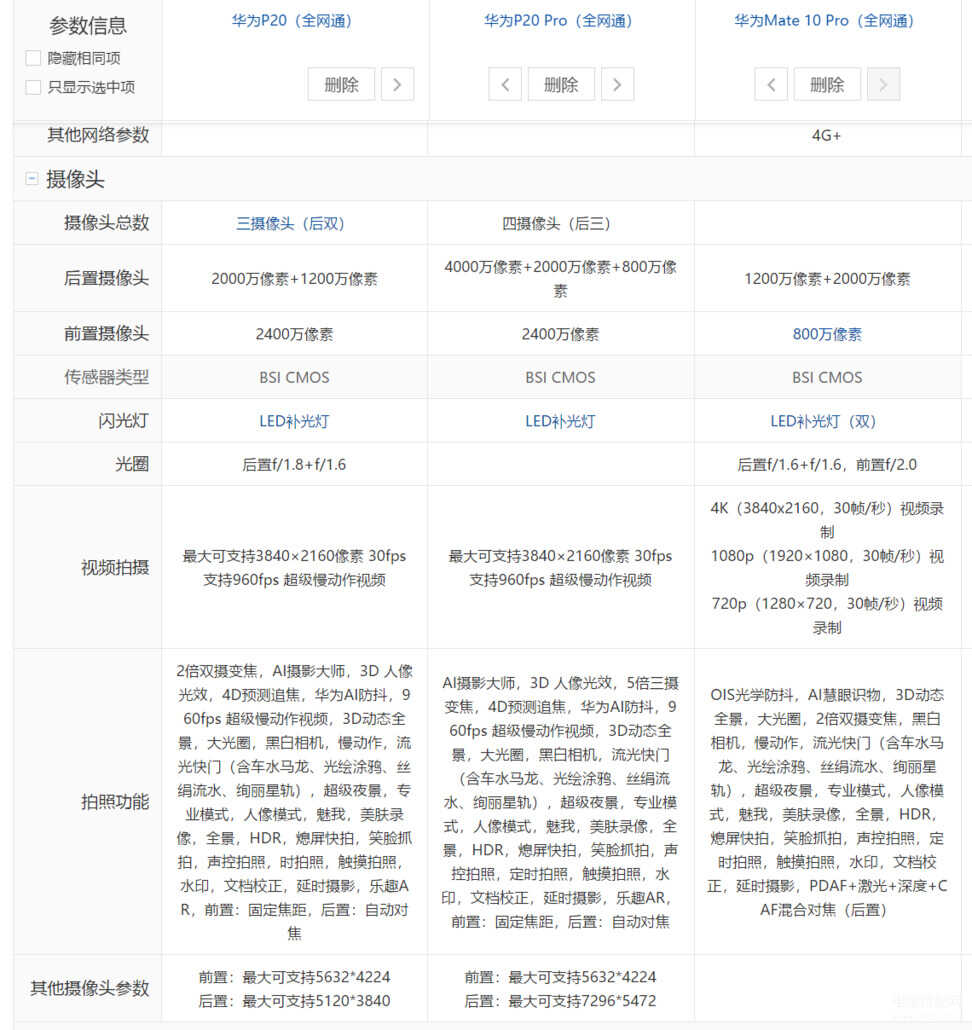 PRO版多了一个4000万的后置摄像头,而随着徕卡的加入和AI功能的加入,让照片更清晰,这也是P系列设计的初衷,让相机更智能,更符合爱照相的时尚商务人士。如果说mate系列注重的是机器运行速度,和像素的提升,那P系列注重的就是照片质量的提升。下图是华为mate10、P20和P20pro相机的对比图除了像素的区别。
