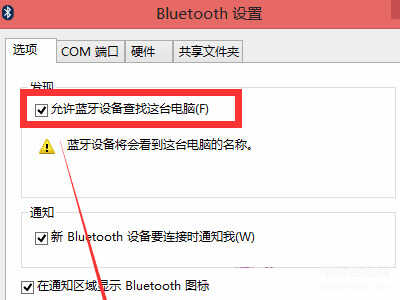 4,在“蓝牙设置”菜单中跳转,在“选项”子菜单下,检查第一个“允许蓝牙设备查找此计算机”,然后单击底部的“确定”。