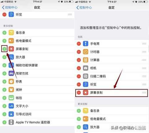 进入“自定控制”后,往下滑界面,找到“屏幕录制”功能,点击图标前的“+”号,然后再滑上去,就可以看到已经添加好“屏幕录制”功能了。