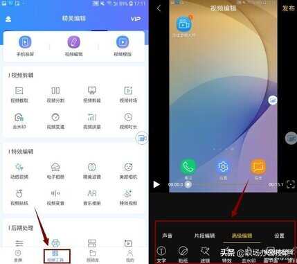 除了“录屏功能”之外,我们可以切换到“视频工具”界面,在这里我们可以对视频进行分割、剪裁、转场、去水印、变速、拼接等多种操作,简直是一个视频编辑的利器。