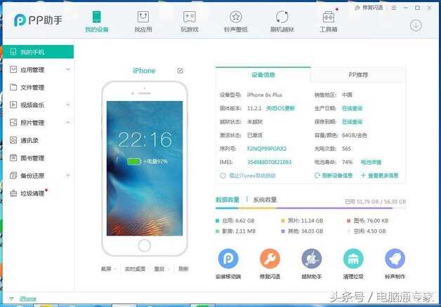 这时你就可以把你的苹果手机插入电脑进行连接了,打开PP助手,手机点击信任,PP助手里面就会显示你手机的一些信息了哦。见下图。