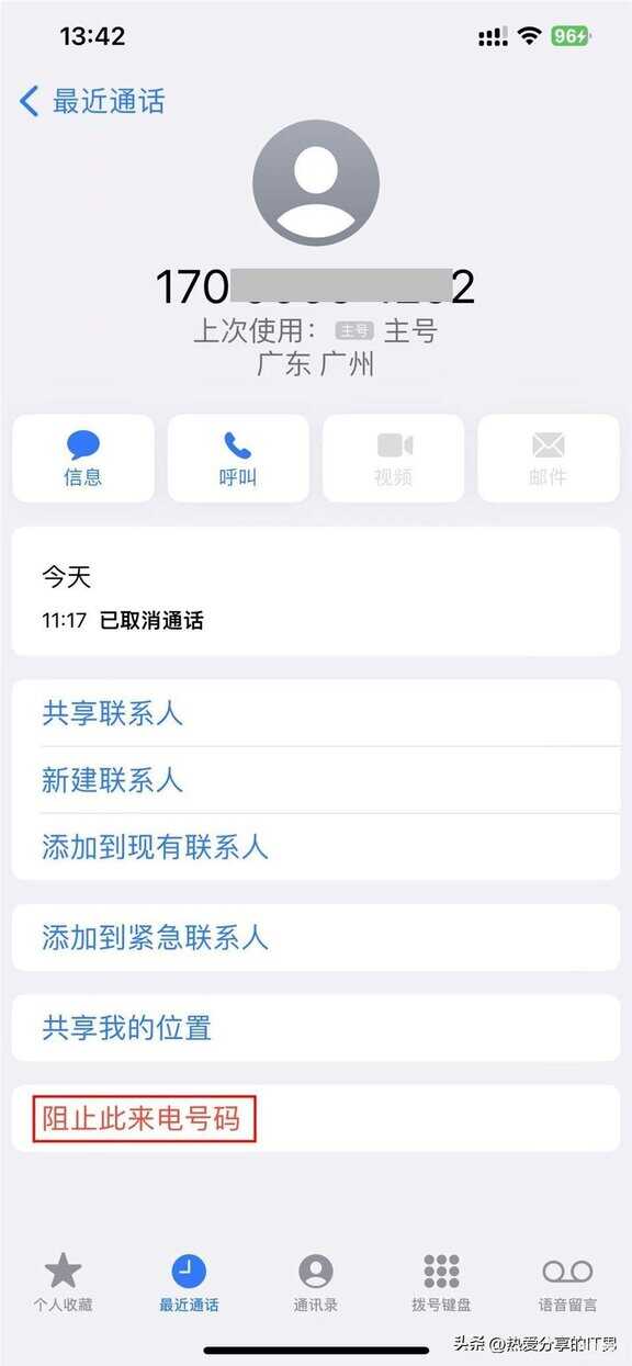 生活中我们不可避免会接到某些电话和短信的骚扰,这些电话有的是推销的,有的可能是诈骗性质的,当然有的是我们知道对方是谁但只是不想接听的。尽管我们可以启用电信运营商提供的骚扰拦截功能来过滤骚扰电话或者启用 iPhone 自带的 “勿扰模式”/“专注模式”来临时屏蔽非通讯录内联系人的电话和短信息,但这几种方式要么在拦截过滤过程中有弹窗和声音通知或者只具有临时性且事后依然在“最近通话”里有记录。有没有一种一劳永逸的方法将某个电话号码彻底屏蔽,让这个电话号码永远打不进来而且手机最近通话里也没有任何记录的方法呢。有,那就是把这个电话号码加入“已阻止的联系人”列表里(俗称黑名单),具体操作方法如下:
