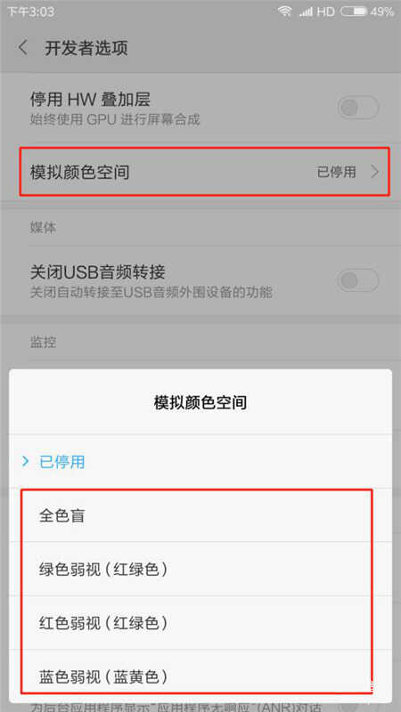 这是手机中一个对色盲患者很贴心的功能,当我们在【开发者选项】中将【模拟颜色空间】功能开启时,手机中就会出现多个颜色选择,我们可以根据自己的需要进行选择操作。