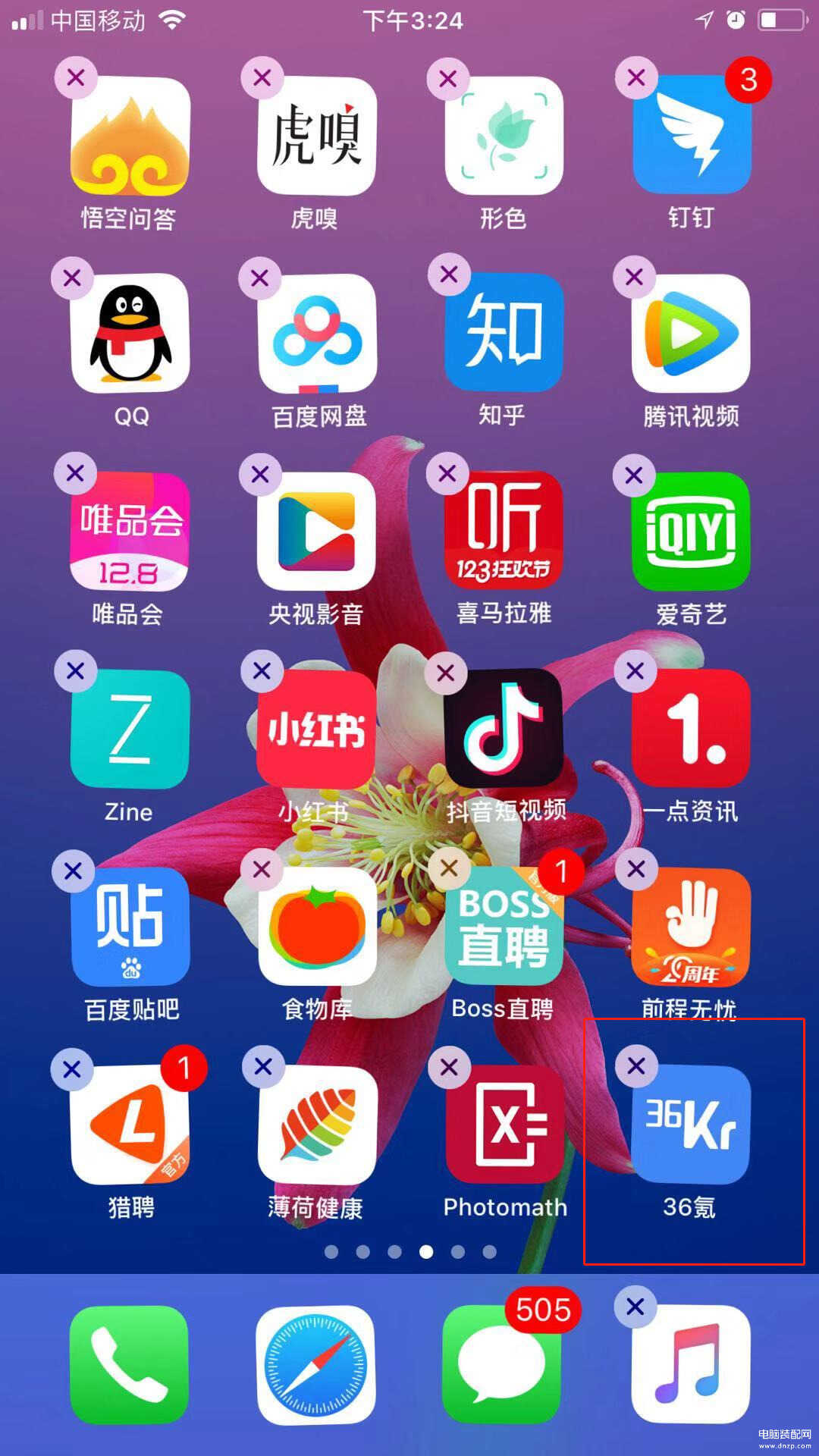 1,打开你的手机,选择你需要隐藏的手机应用,用一只手长按,进入到手机的抖动模式。例子中我选择的是图中红框框框住的的这一款需要隐藏的应用。