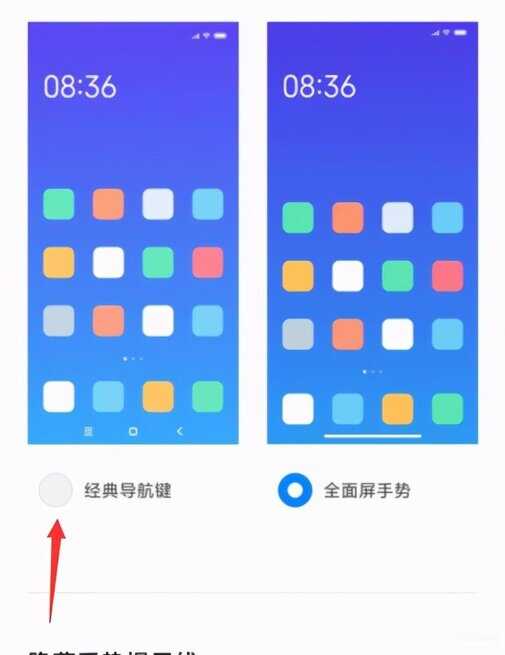 3、然后切换至经典导航键即为恢复,同理选择全面屏手势选项会隐藏